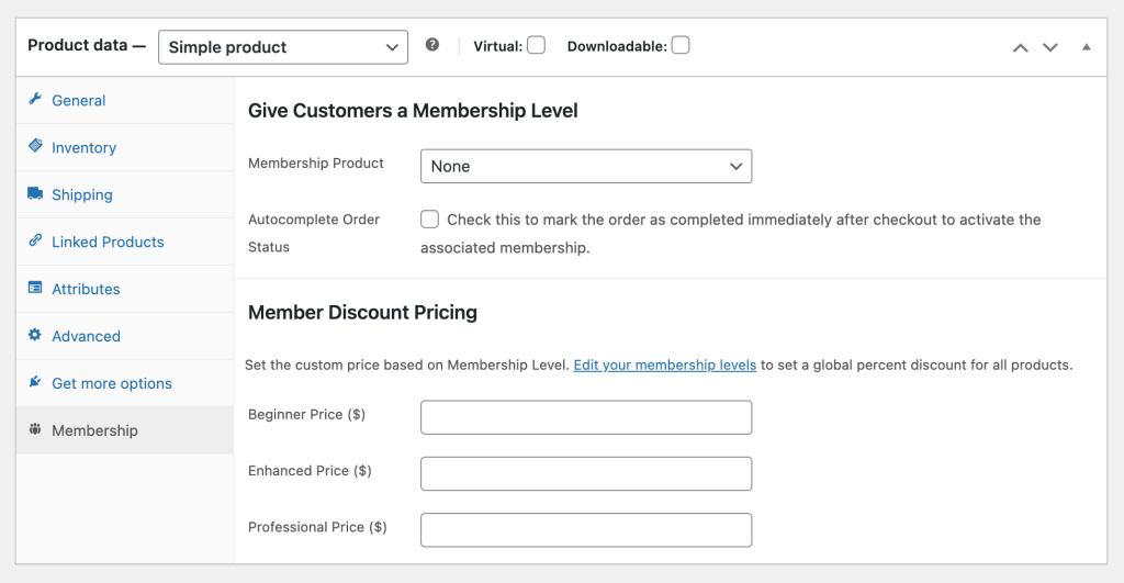 Inside the product edit screen, you’ll see the membership settings.
